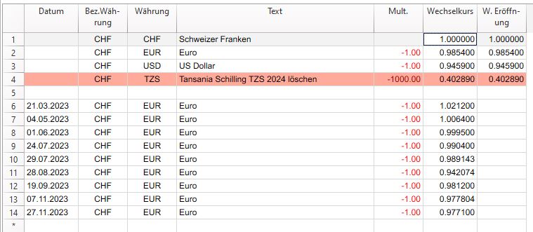 Führe ich anschliessend eine Aktualisierung der Eröffnungssalden aus, wird das Feld „W. Eröffnung“ durch das Programm automatisch und ohne Rückfrage durch den Eröffnungskurs des Vorjahres (!!) überschrieben. Hier also wird für 2022 als Eröffnungskurs der Wert 1,0981 aus dem Vorjahr eingetragen und entsprechend die Berechnung durchgeführt.