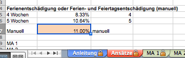 Sie können auf den jeweiligen Mitarbeiter-Tabs auswählen, ob Sie dem Mitarbeiter entweder 4 oder 5 Ferienwochen abrechnen oder einen manuellen Wert auswählen, der im Tab „Ansätze“ konfiguriert werden kann: